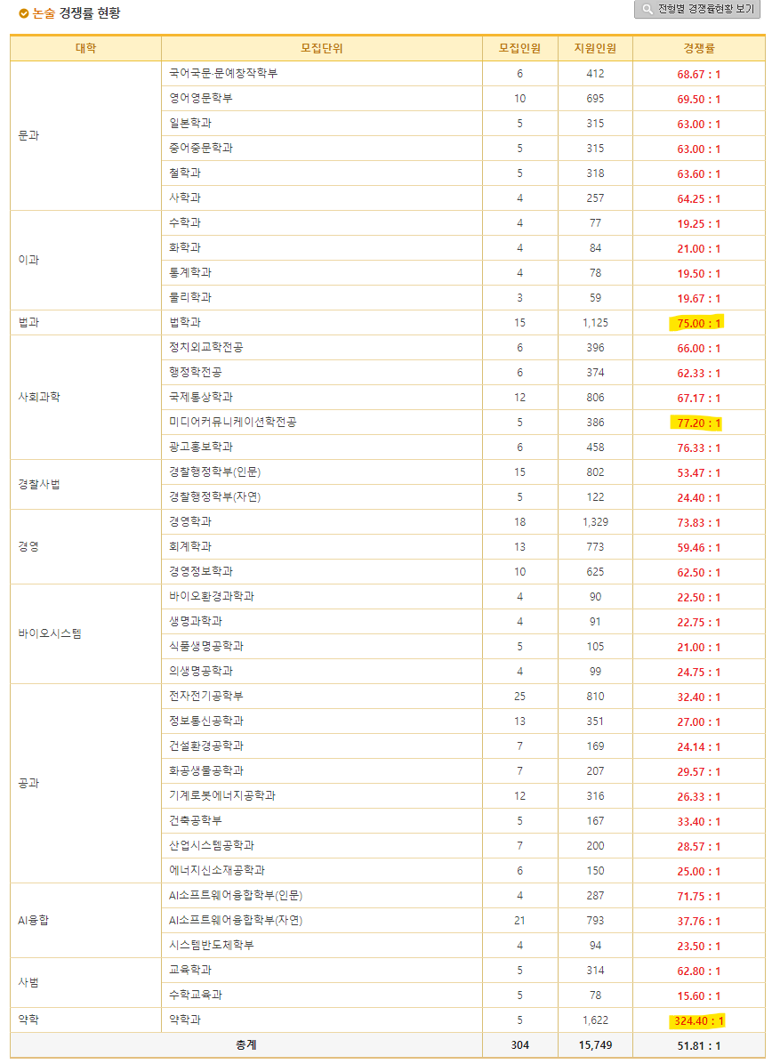 <2024학년도 최고 경쟁률 학부/학과>