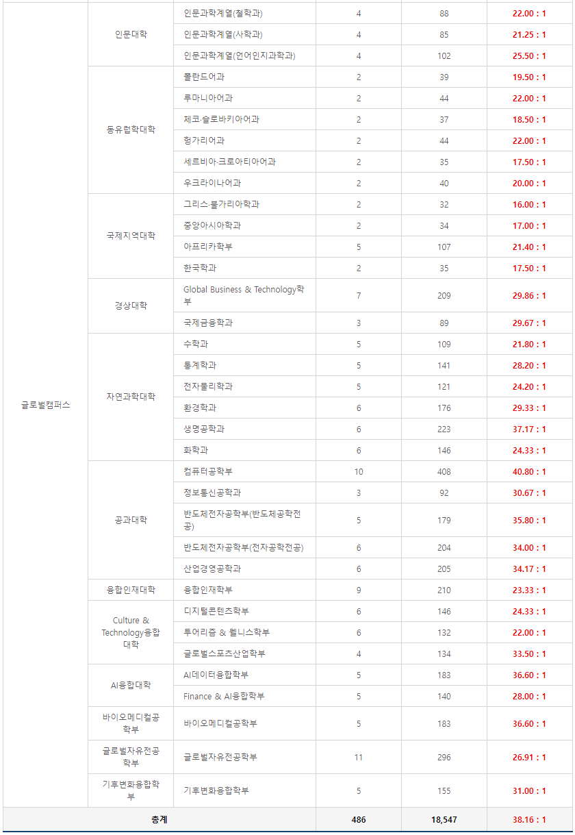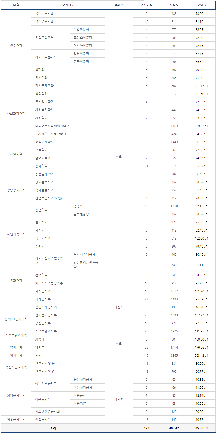 학교/학과별로 경쟁률은 조금씩 상이하지만 다른 전형에 비해서 매우 높은 편입니다.